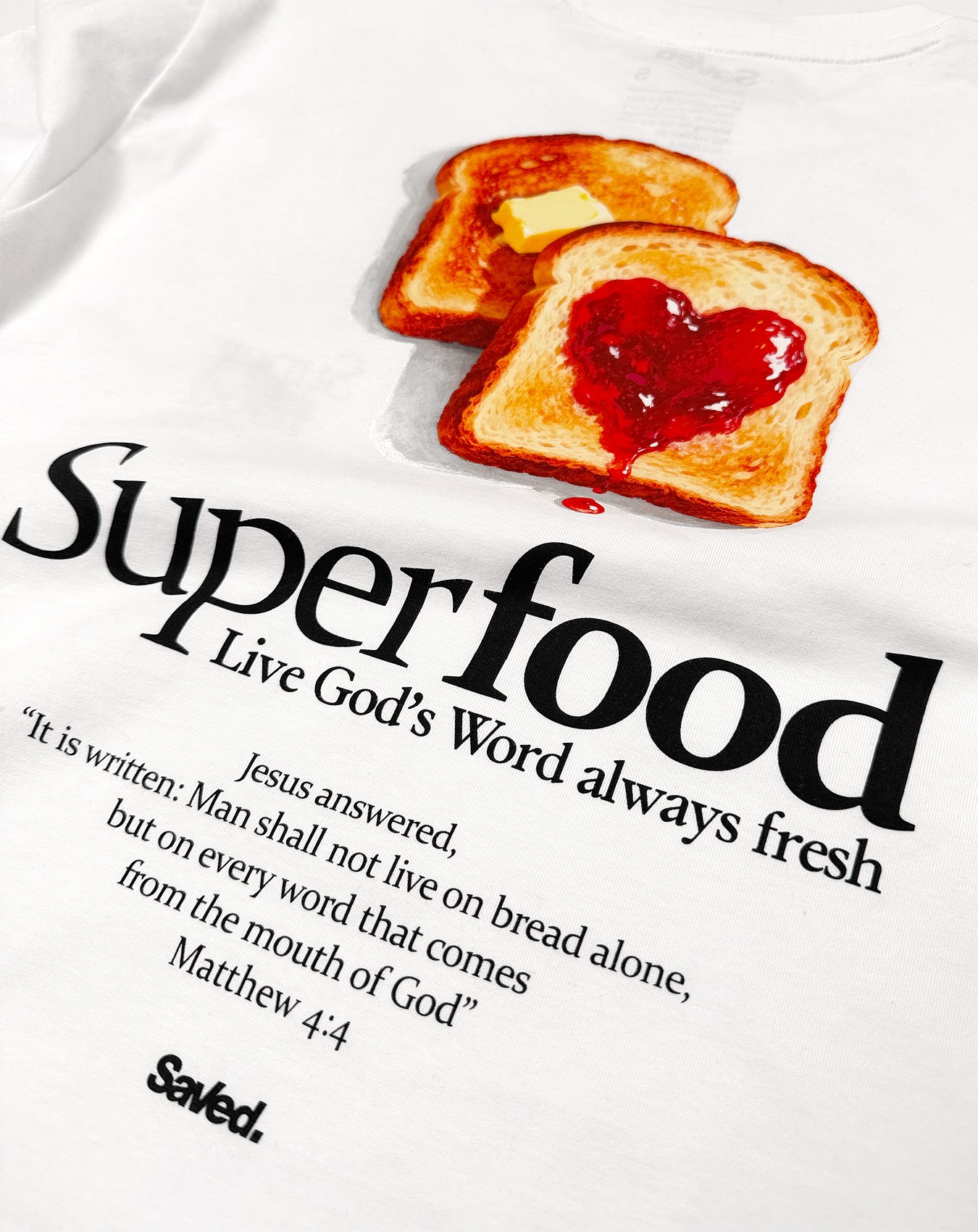 Ew. Mateusza 4:4 „A on odpowiedział: Jest napisane: Nie samym chlebem będzie żył człowiek, ale każdym słowem pochodzącym z ust Boga.” Ta koszulka chrześcijańska z długim rękawem ma na celu przypomnienie o tym że żyjemy w ciele, ale to pokarm duchowy, Słowo Boże jest prawdziwym pokarmem. Nosić ją to zachęta dla innych aby zakosztowali że Bóg jest dobry aby nie żyli już samym tylko chlebem, ale poznali Boga Jezusa bo On jest miłością.